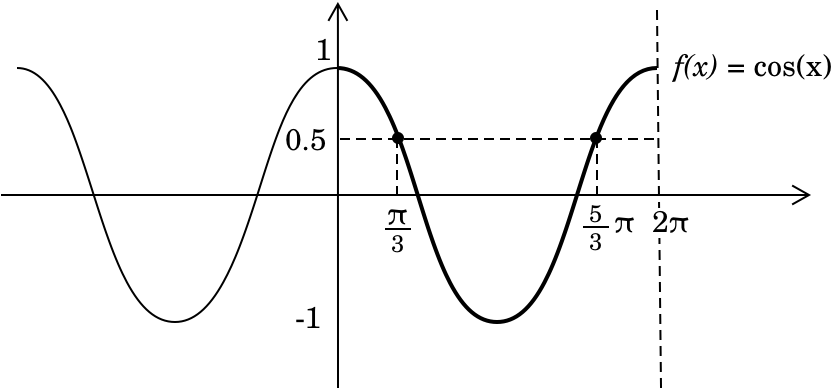 Наприклад, ми хочемо розв'язати рівняння \(\cos x = 1/2\) на проміжку \( [0, 2\pi] \). Побудуємо пряму на рівні значення \(1/2\) на графіку функції косинуса.