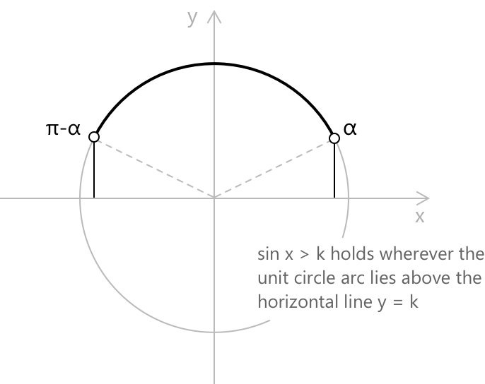 Першим кроком є знаходження опорного кута \(\alpha = \arcsin k\), який лежить у \([-\pi/2,\, \pi/2]\). На одиничному колі умова \(\sin x > k\) виконується на дузі, де вертикальна координата перевищує \(k\). Ця дуга йде проти годинникової стрілки від \(\alpha\) до \(\pi - \alpha\).