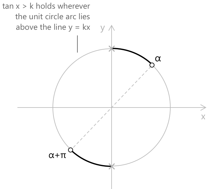 \[\alpha + 2k\pi < x < \pi – \alpha + 2k\pi \] \[k \in \mathbb{Z}\]