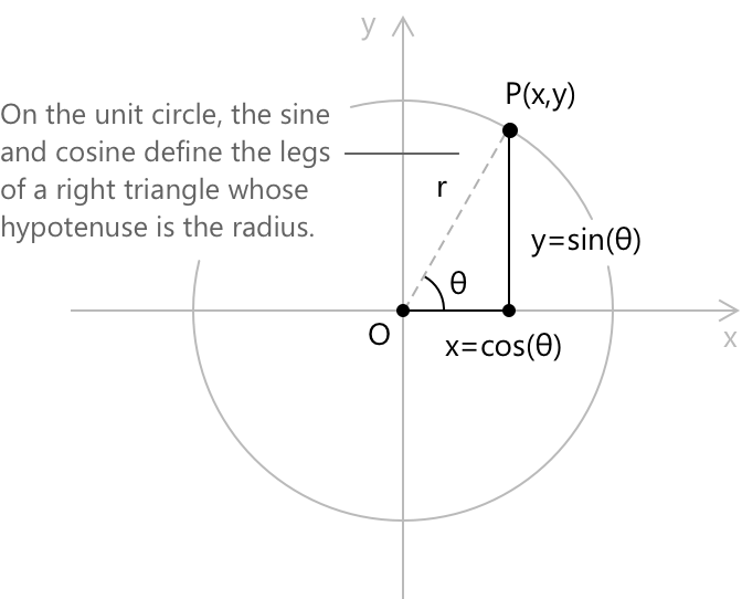 Після того як поняття синуса та косинуса були введені через геометрію одиничного кола, їхній взаємозв'язок стає особливо прозорим. Якщо точка \( P \) лежить на одиничному колі та відрізок \( \overline{OP} \) утворює кут \( \theta \) з позитивною віссю \( x \), то прямокутний трикутник з вершинами в \( O \), \( R \) та \( P \) має гіпотенузу довжиною \( 1 \), горизонтальний катет довжиною \( \cos\theta \) та вертикальний катет довжиною \( \sin\theta \). Застосування теореми Піфагора до цього трикутника дає наступну тотожність: \[ \sin^2\theta + \cos^2\theta = 1 \]