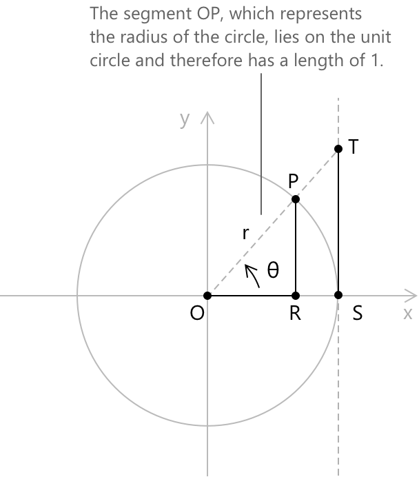 За домовленістю, напрямку проти годинникової стрілки присвоюється позитивний знак, а напрямку за годинниковою стрілкою — негативний знак. Отже, кут \( \theta \) є позитивним, коли точка \( P \) досягається рухом проти годинникової стрілки від позитивної осі \( x \), і негативним в іншому випадку. Нехай \( S \) буде точкою \( (1, 0) \), де одиничне коло перетинає позитивну вісь \( x \), і нехай \( T \) буде точкою, де пряма, що проходить через \( O \) та \( P \), перетинає вертикальну дотичну до кола в точці \( S \).