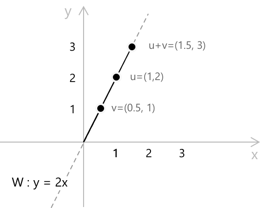 Діаграма ілюструє дві умови замкненості для підпростору \(W = \{(x, y) \in \mathbb{R}^2 : y = 2x\}\). Будь-який вектор у \(W\) лежить на прямій, що проходить через початок координат з кутовим коефіцієнтом \(2\). Додавання двох таких векторів або множення одного з них на скаляр завжди дає вектор, який залишається на тій самій прямій, що підтверджує замкненість \(W\) відносно обох операцій.